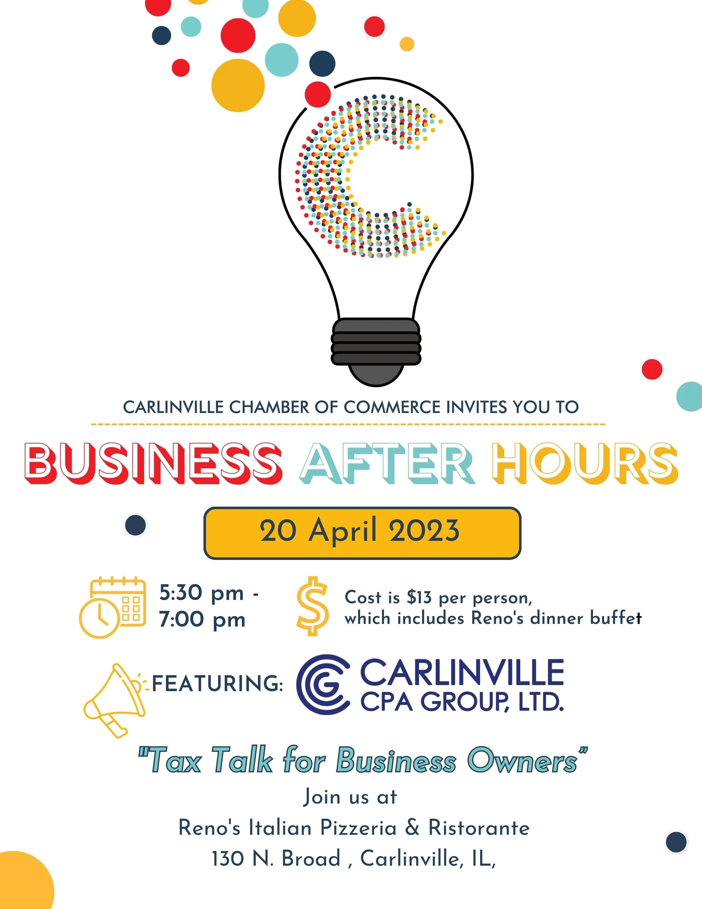Chamber After Hours Event Thursday, April 20, 2023 5:30 PM 7:00 PM Reno's Pizzeria 130 North Broad Street Carlinville, IL, 62626 United States (map) Google Calendar ICS Come join us for Business After Hours, April 20th 5:30 pm - 7 pm at Reno’s Pizza. Featuring Carlinville CPA’s Group presenting, “Tax Talk for Business Owners.” Cost is $13 per person, which includes the dinner buffethttps://www.facebook.com/events/986748285660815
