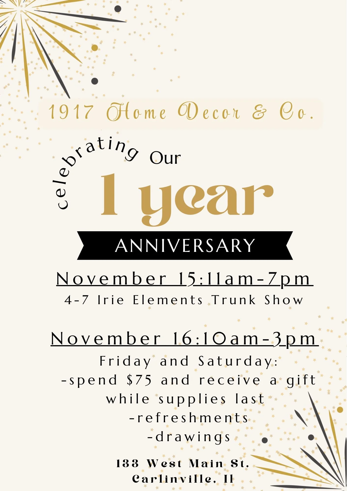 1917 Home Décor & Co. : 1yr Anniversary Celebration Friday, November 15, 2024 11:00 AM 7:00 PM 1917 Home Décor & Co 133 West Main Street Carlinville, IL, 62626 United States (map) Google Calendar ICS